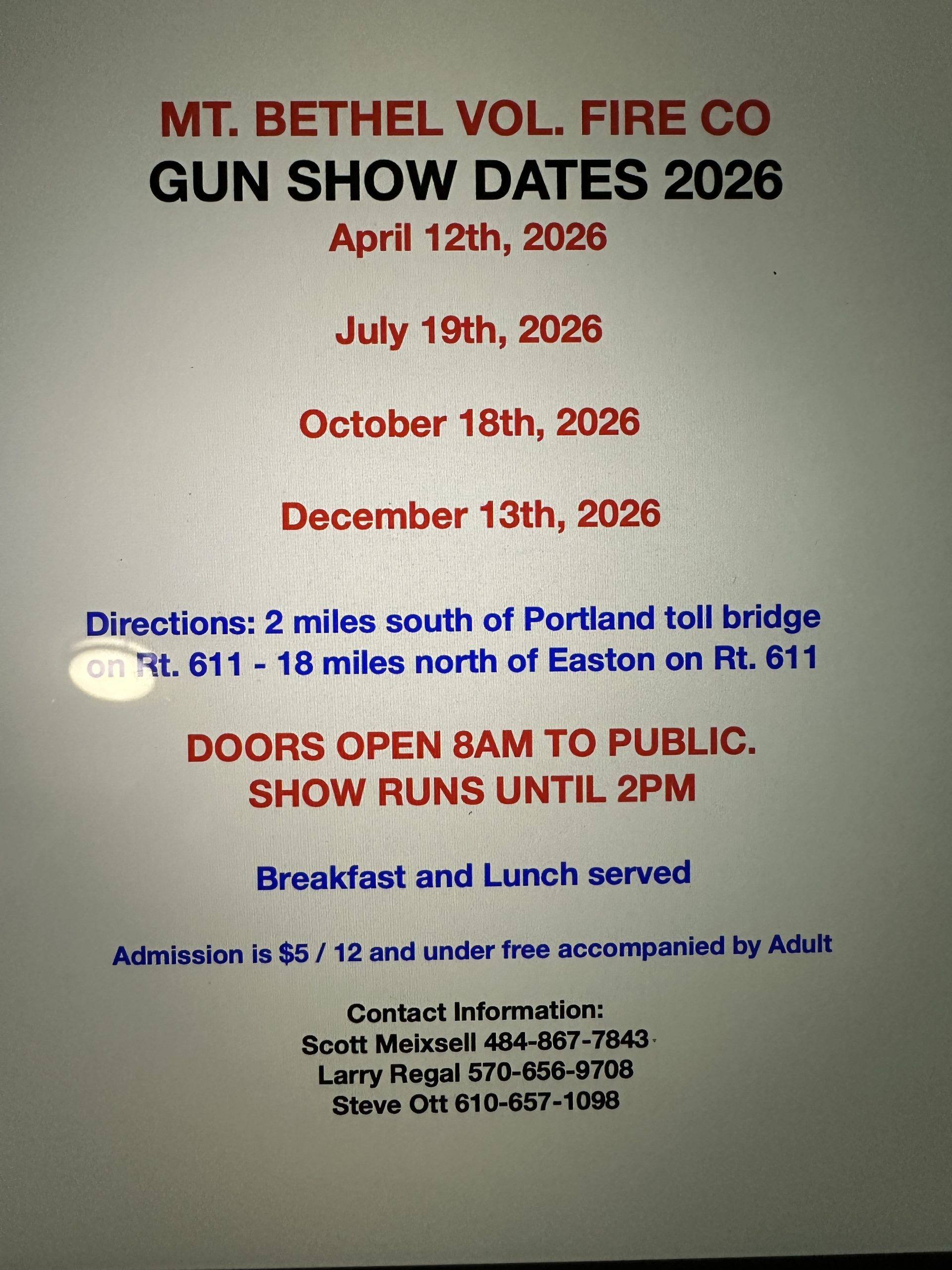 Mount Bethel Vol. Fire Co. 2341 N. Delaware Drive, Mt. Bethe, PA, United StatesFlyer 2026 Gun Show Dates